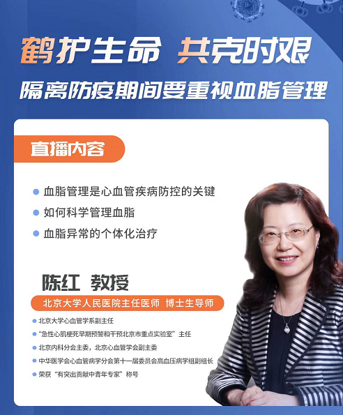 本周一(4月6日)的晚上十九点三十分,由北京大学人民医院主任医师、心血管领域专家陈红教授为主讲、以“隔离防疫期间要重视血脂管理”为主题的直播课正式开始。